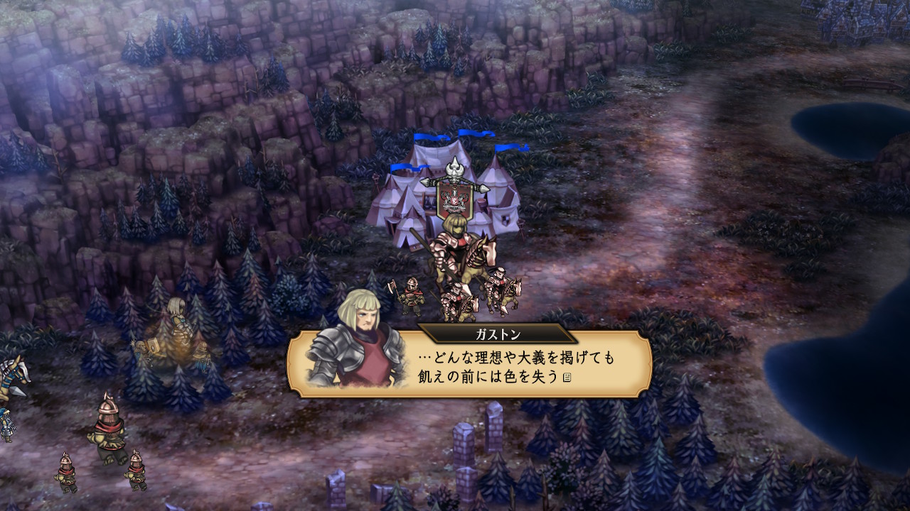 想定された順番で進行して適度に部隊を考えれば苦労しないバランス、舐めると崩れるがリスタートにまではならない歯応え、進捗によるSLG戦略要素の追加、特定の順番で出てくる強制ではない1,2程度レベル上げるか金稼ぎ程度のフリーバトル、国によって派手に変わる風景、全てが60時間弱のSLGに対して丁度よかった。